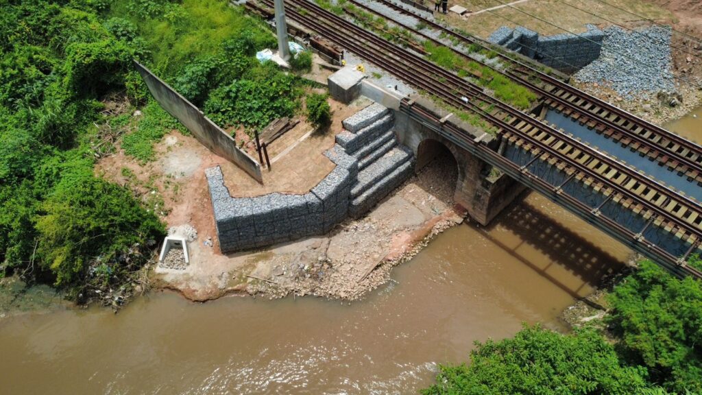 Na sequência, foram executadas a instalação de tirantes e a injeção de calda de cimento, preparando a estrutura para a implantação do muro de contenção sob a linha férrea.